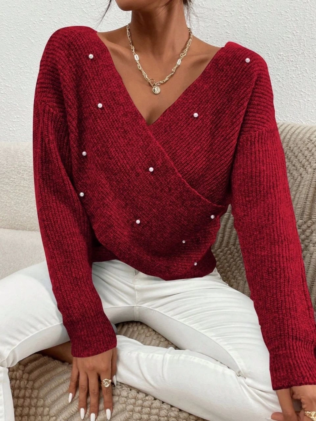 İncili Çapraz Kazak Bordo, şıklığı ve rahatlığı bir arada sunar.