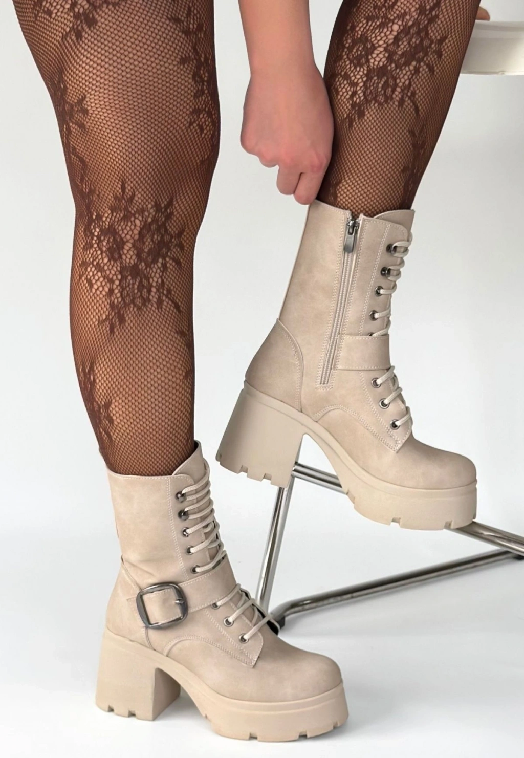 • Linma Bej Nubuk Bağcıklı Topuklu Bot