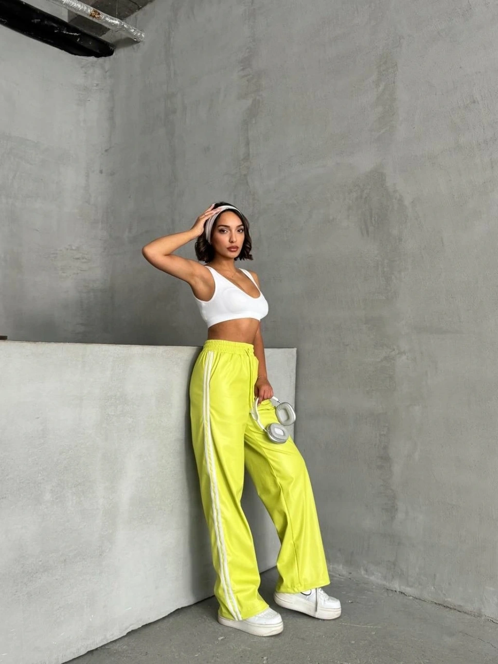 Şıklığı ve rahatlığı bir arada sunan yeşil şeritli deri pantolon h26430, gardırobunuzun favori parçası olmaya aday.